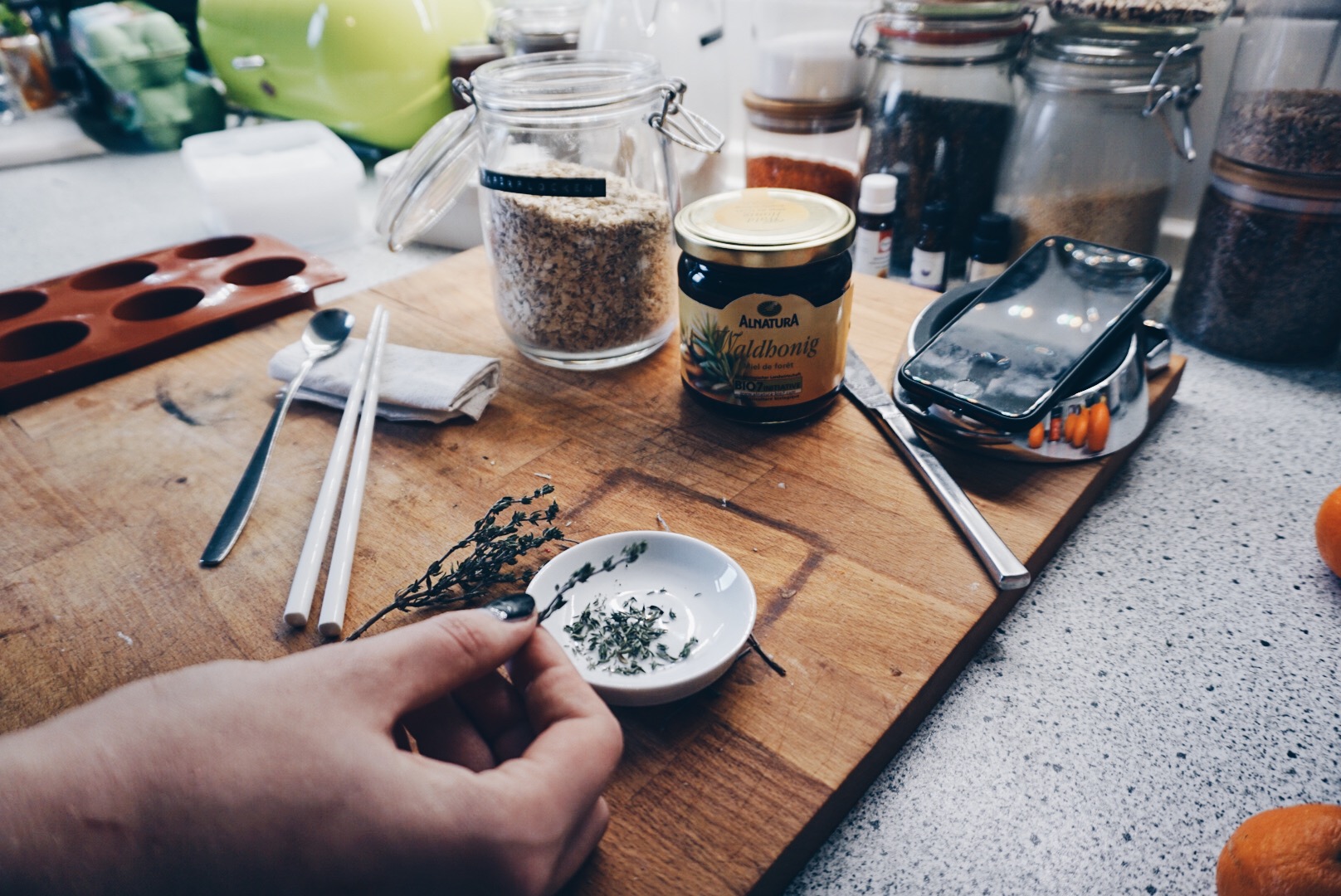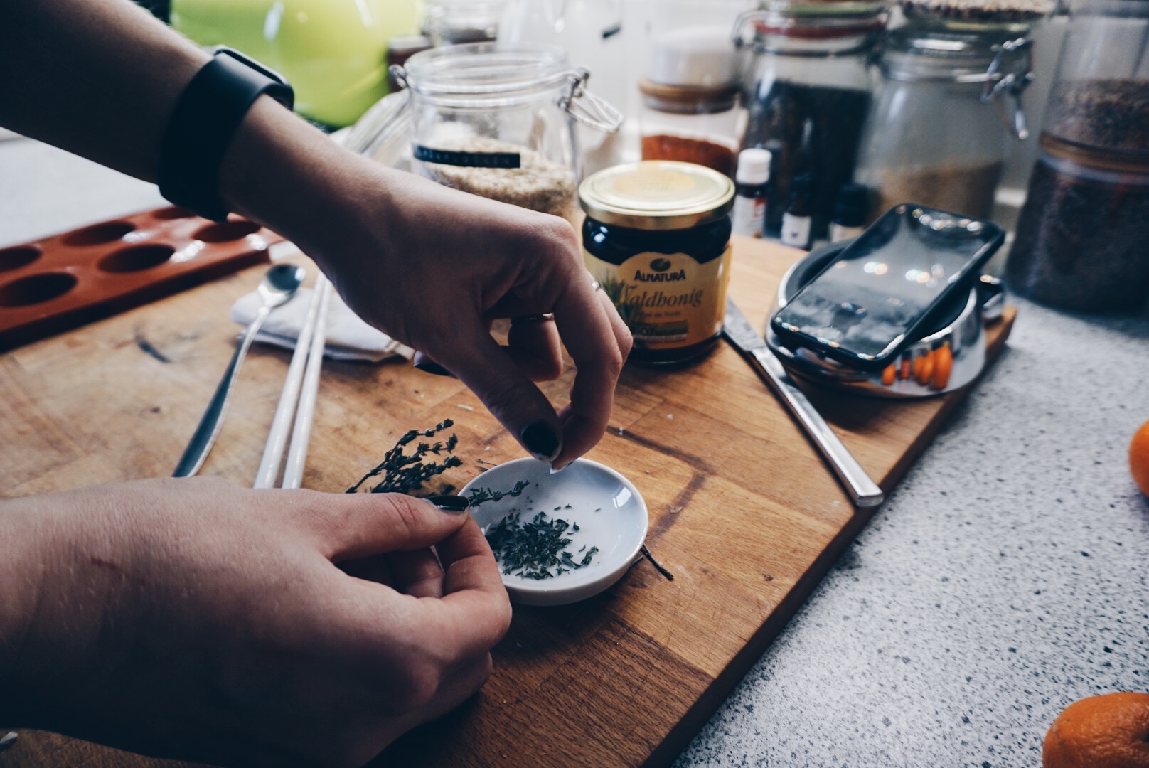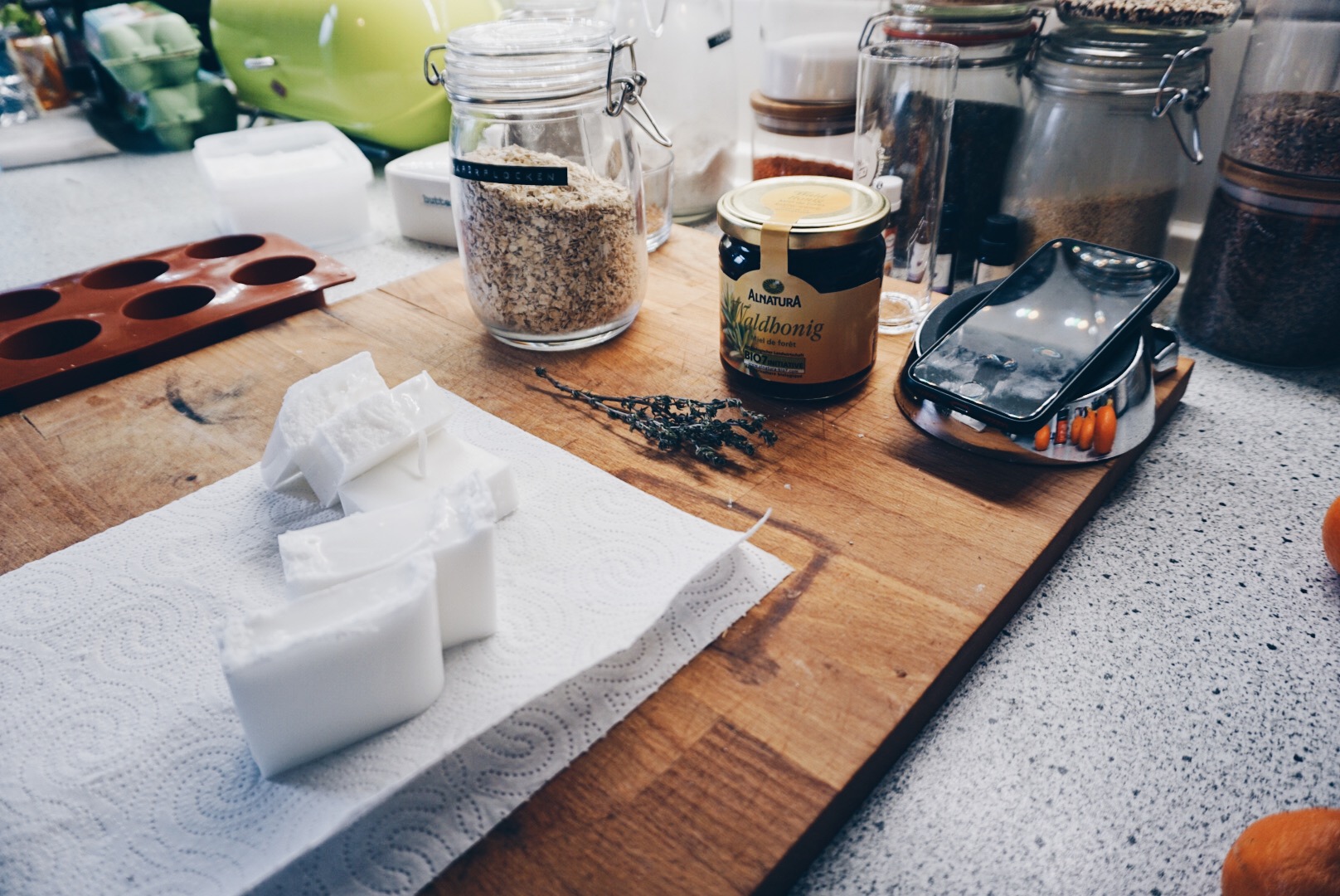 Die Seifenmasse in kleine Stücke schneiden und in einem Gefäß in der Mikrowelle oder im Wasserbad nach Anleitung zum schmelzen bringen. Wenn die Seifenmasse flüssig ist den rohen Honig hinzufügen (hier wieder Waldhonig) gut verrühren bis er ganz aufgelöst ist. Den getrockneten Thymian ebenfalls in die Seifenmasse rühren und anschließend in die vorbereiteten Formen gießen um die Seifen auskühlen zu lassen.