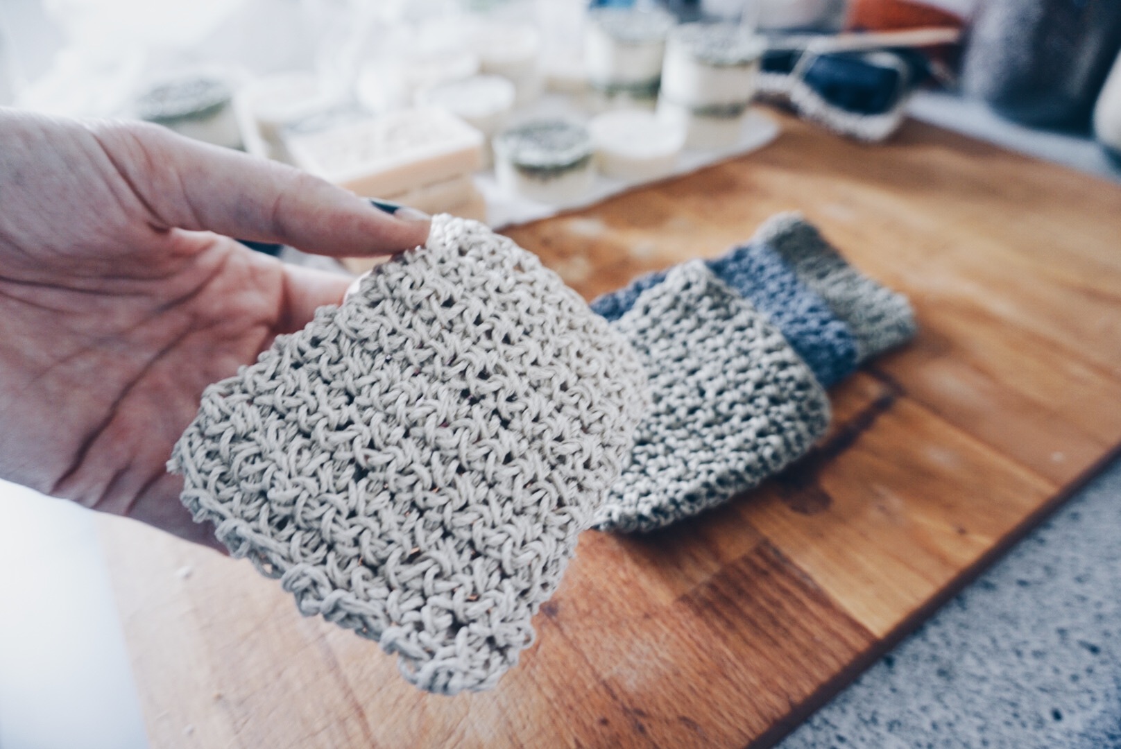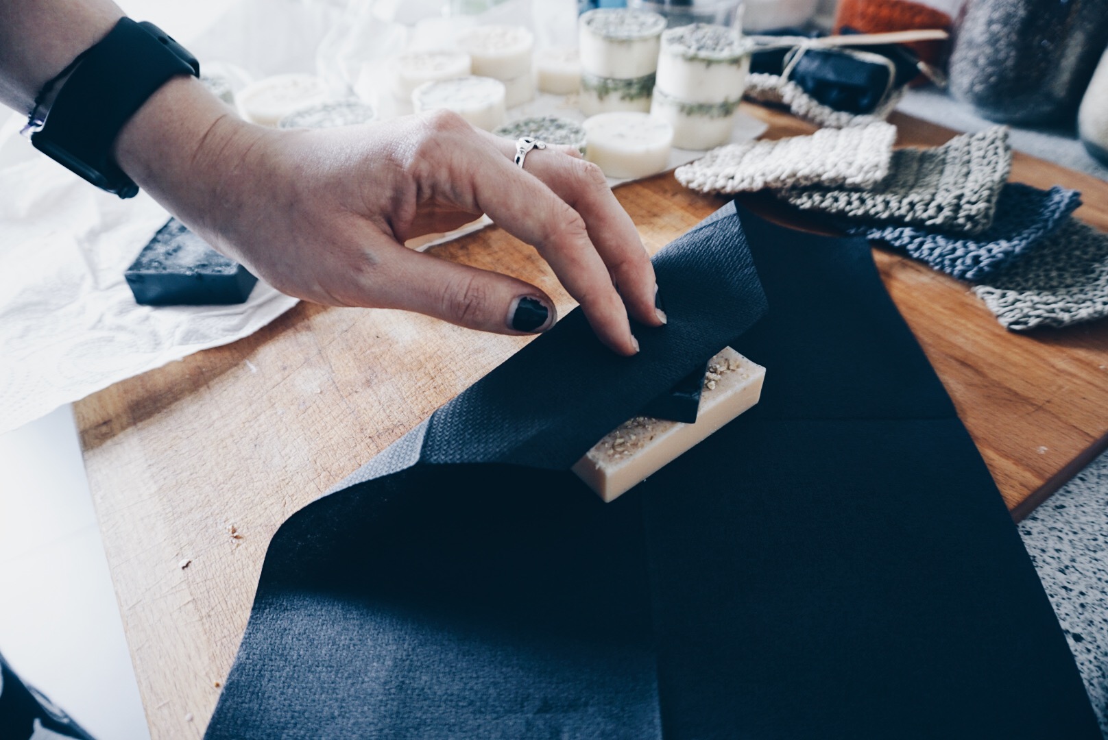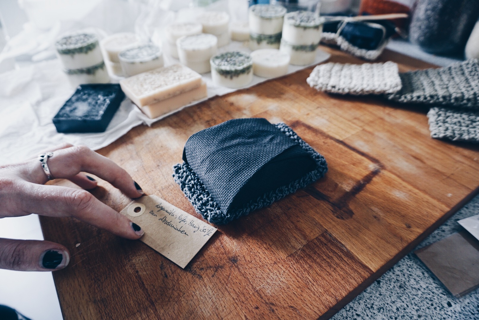 Dadurch das die Seifenrohmasse auch ausgekühlt immer ein bisschen weich wirkt, habe ich sie in schwarzen festen Servietten verpackt. Die kleinen Beutelchen sind einfach aus Hanfgarn gehäkelt und man kann die Seife darin einpacken und das Beutelchen wie einen kleinen Waschlappen nutzen. Die Idee dazu gab mir Hydrophil, deren Waschsäckchen ich zum duschen benutze und in dem meine Seifenstücke sich super aufbewahren lassen.