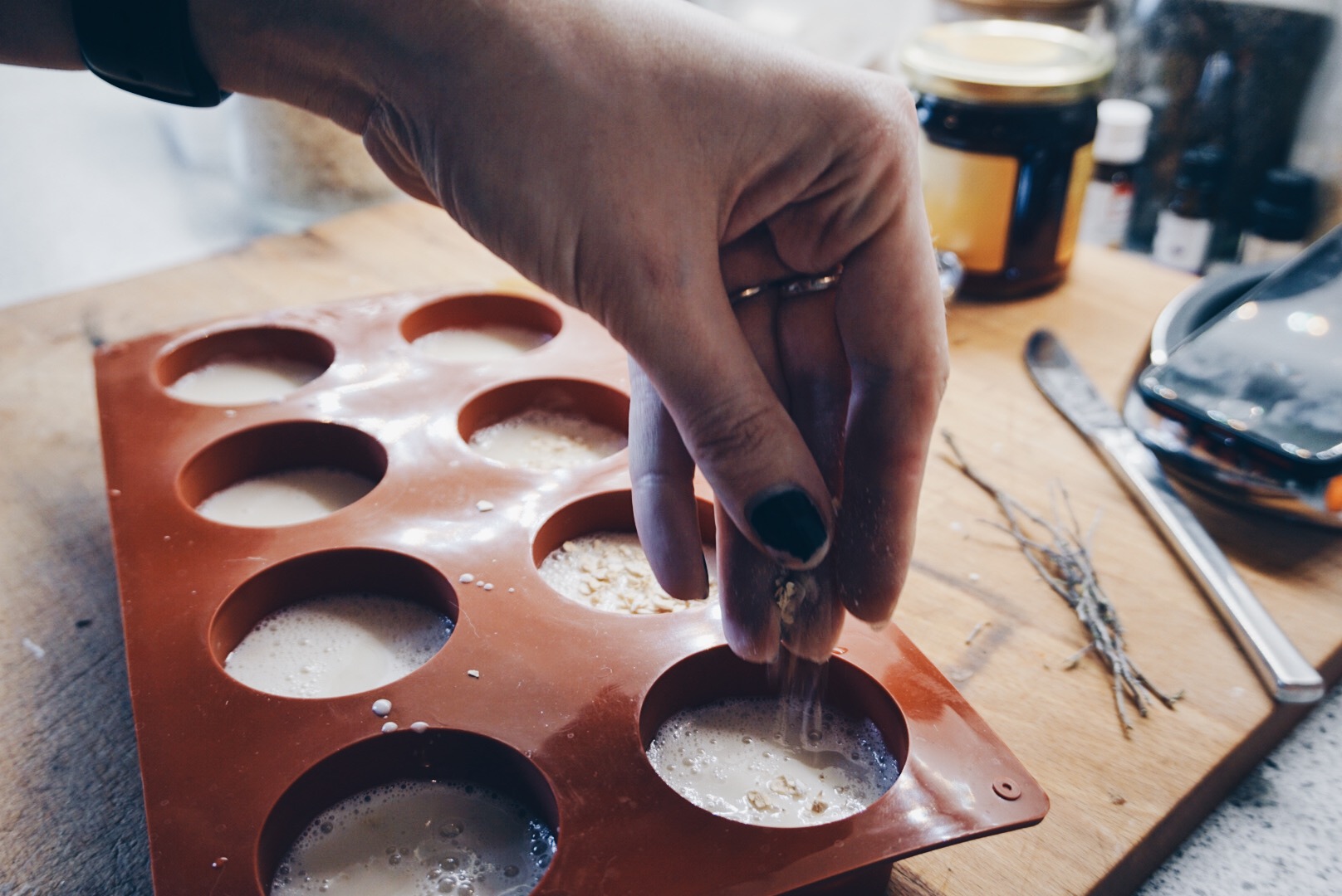 Die Seifenmasse in kleine Stücke schneiden und in einem Gefäß in der Mikrowelle oder im Wasserbad nach Anleitung zum schmelzen bringen. Wenn die Seifenmasse flüssig ist den rohen Honig hinzufügen (ich habe Waldhonig benutzt) gut verrühren bis er ganz aufgelöst ist. Anschließend kann man optional die Farbe der Seife mithilfe von gelb und einem kleinen bisschen rot noch honigfarbener machen, das ist aber nicht unbedingt notwendig. Zum Schluss beliebig viel Haferflocken in die Masse rühren und anschließend in die vorbereiteten Formen gießen. Dann müssen die Stücke nur noch auskühlen.