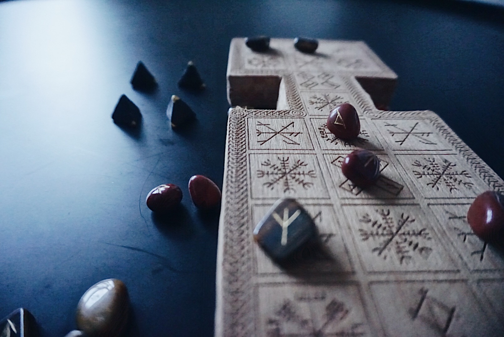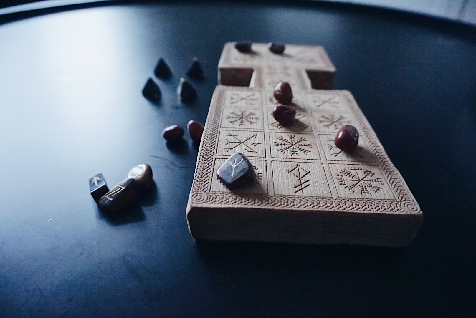 Meine Spielsteine sind eigentlich Runensteine aus drei bunten Futhark-Sets die ich ursprünglich als Gimmick für meinen Geburtstag besorgt hatte (damit jeder Gast seine Glücksrune ziehen kann) doch weil die Lieferung sich so sehr verspätete wurde daraus nichts und jeweils sieben Tigeraugen und rote Jaspis funktioniere ich nun zu Spielsteinen um. Die darauf eingravierten Runen passen natürlich unfassbar gut zu dem Aussehen des Spielbrettes.