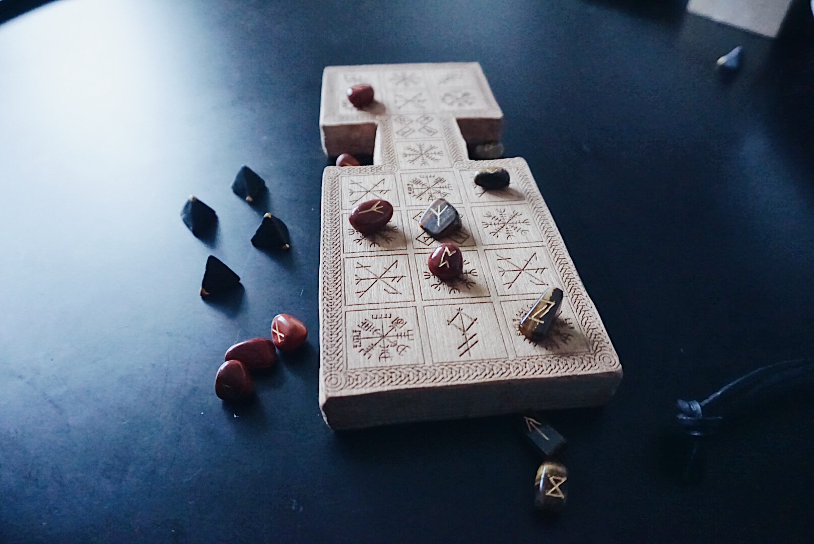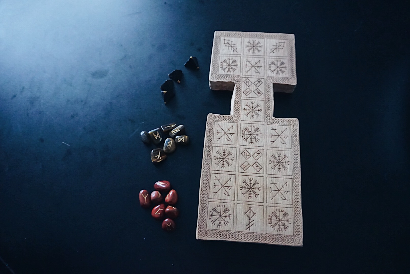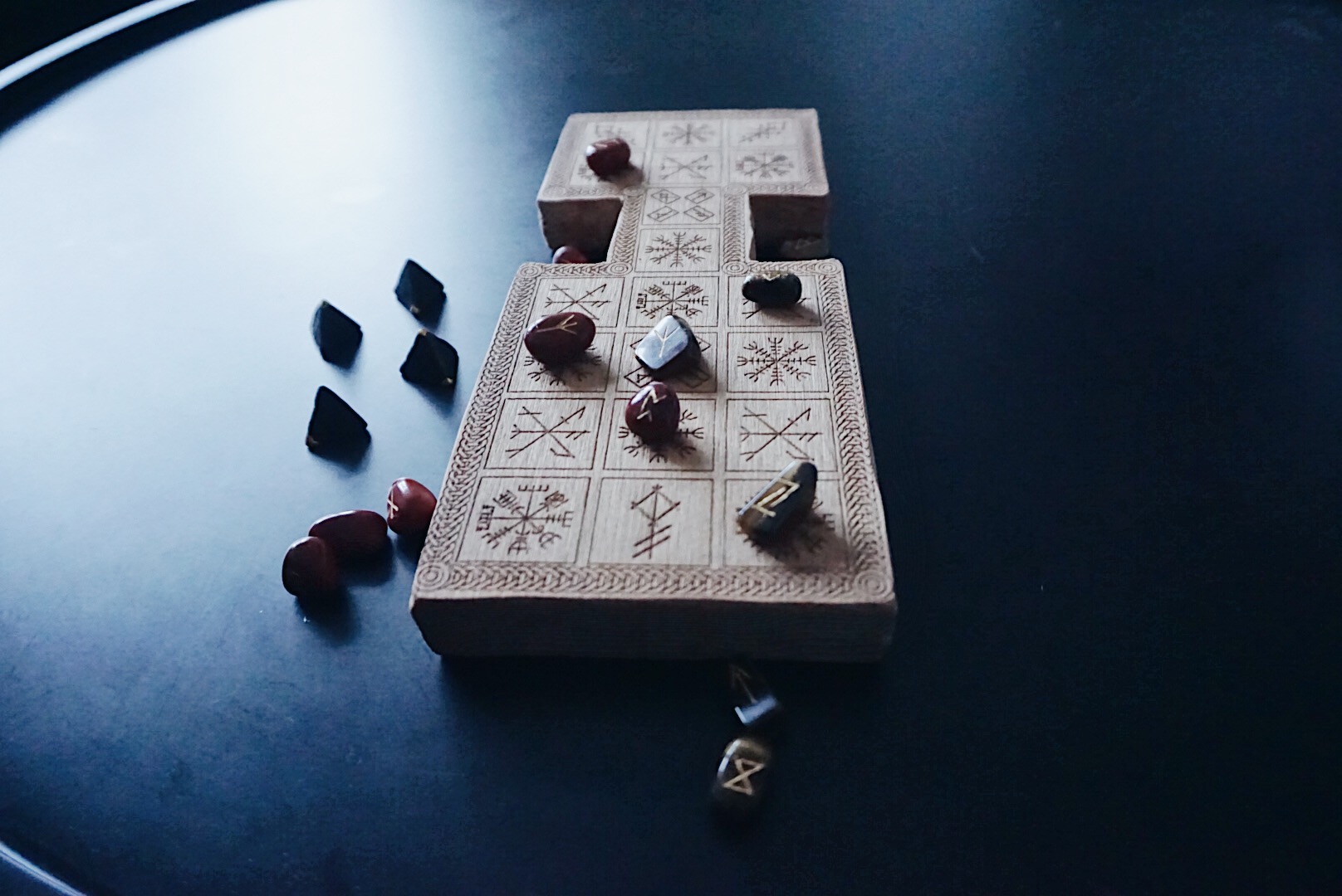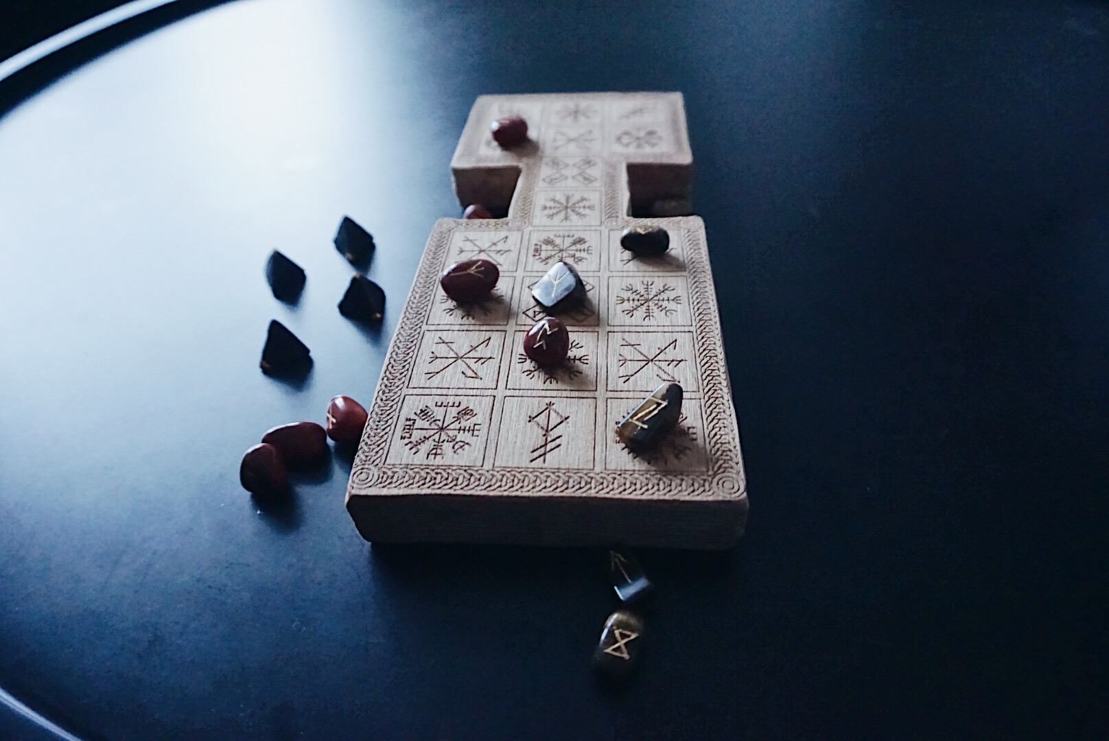Ich habe mir, um ehrlich zu sein, keine tiefgreifenden Gedanken gemacht. Ich wollte einfach die Symbole gegen Runen austauschen um es äußerlich anzupassen. Die Feldersymbole wurden zum isländischen Vegvisir und ich kreierte ein paar gebundene Runen die gut zu den anderen Feldern passten. Ich erstellte also eine Vektordatei und sandte Benni diese zu. Nach ein paar Probelasersessions in seinem Livestream auf YouTube war klar, dass die Datei sowie das Projekt noch ein wenig mehr Arbeit brauchen würden.