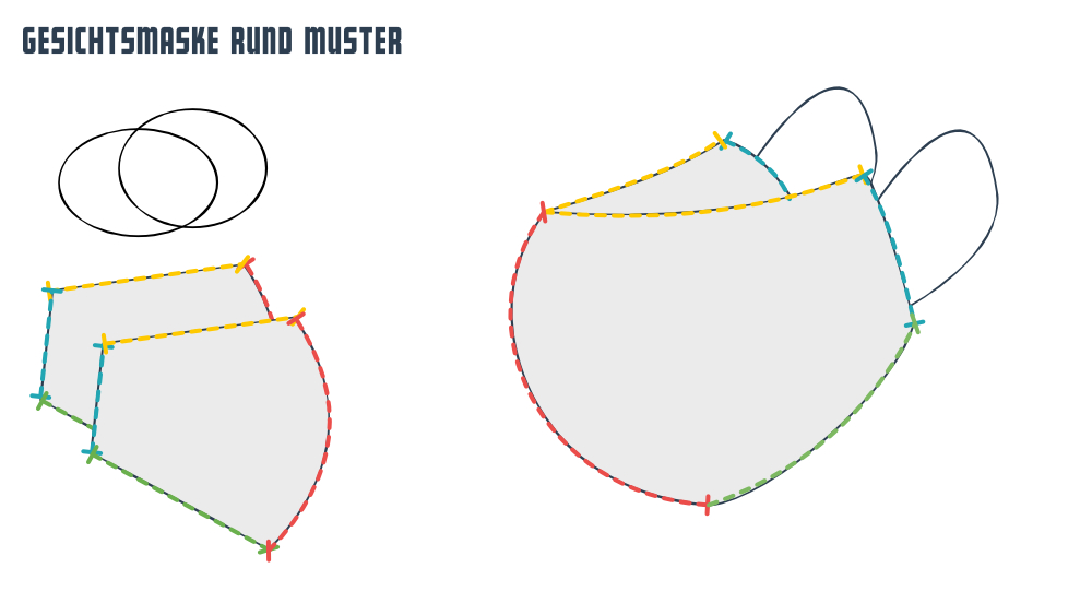Zuerst näht man die große Rundung von zwei Teilen an der roten Linie aufeinander und wiederholt das mit den anderen beiden Stoffteilen sodass zwei Maskenförmige Teile fertig sind. Aufgrund der Naht vor dem Mund ist diese Art der Maske weniger gut geeignet da durch die Nahtlöcher potentiell mehr Aerosol durch den Stoff dringen kann. Es gibt da natürlich Abwandlungen in den Schnittmustern. Hier in Form der Olson Mask zum Beispiel falls ihr euch deswegen Gedanken macht.