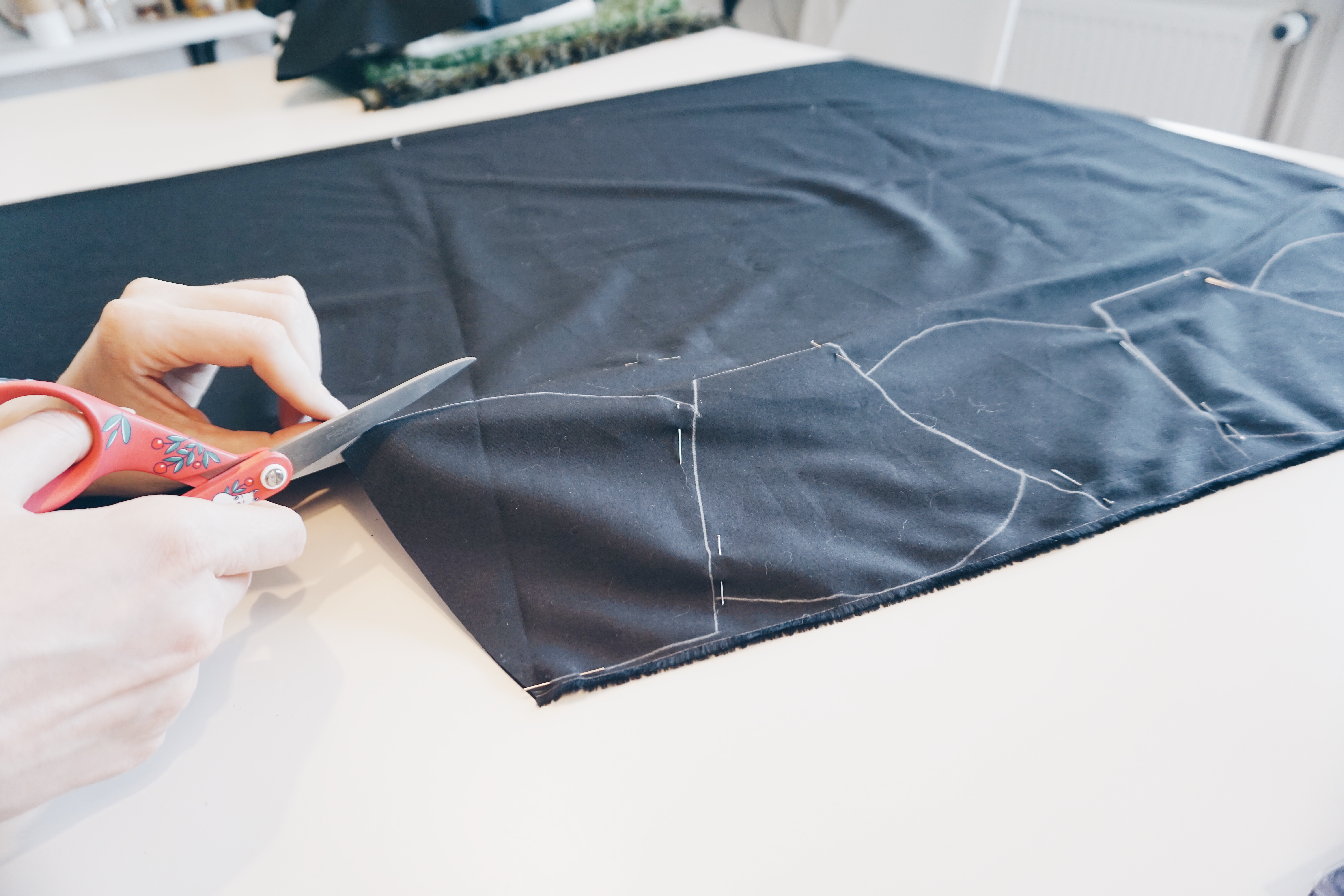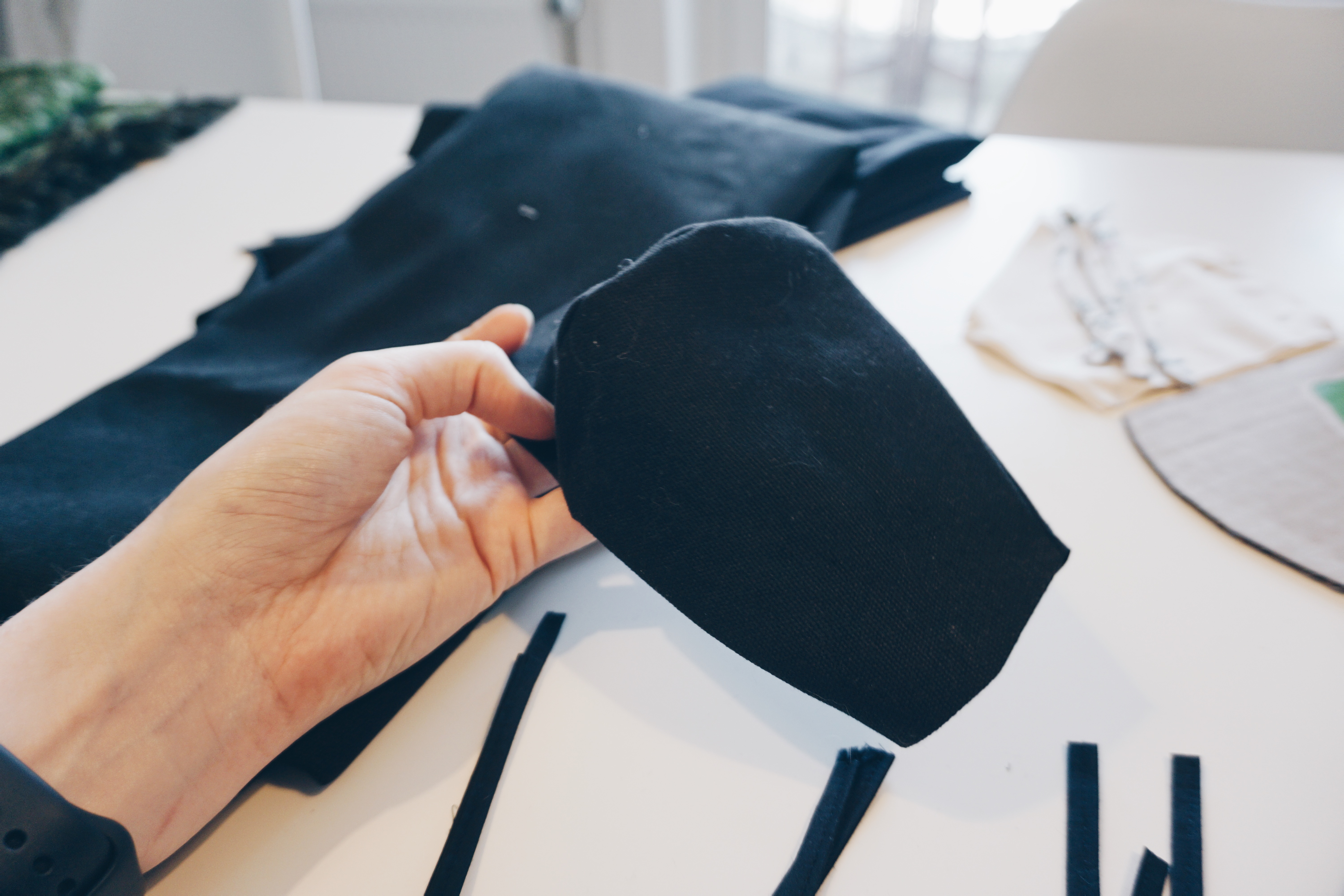 Ich habe mich an die Video Anleitung von Jess Dang gehalten. Sie näht ihre Masken aus alten T-Shirts und mit der Hand. Ich benutze für meine Masken schwarzen Baumwollstoff, Baumwollcanvas, Ikea Bomull sowie bunten Jerseystoff. Ich hab noch Leinen und Wollreste die ich später für eine andere Art Maske verwenden möchte. In diesem Schnittmuster ist eine 5mm Nahtzugabe bereits mit eingerechnet und nicht eingezeichnet.