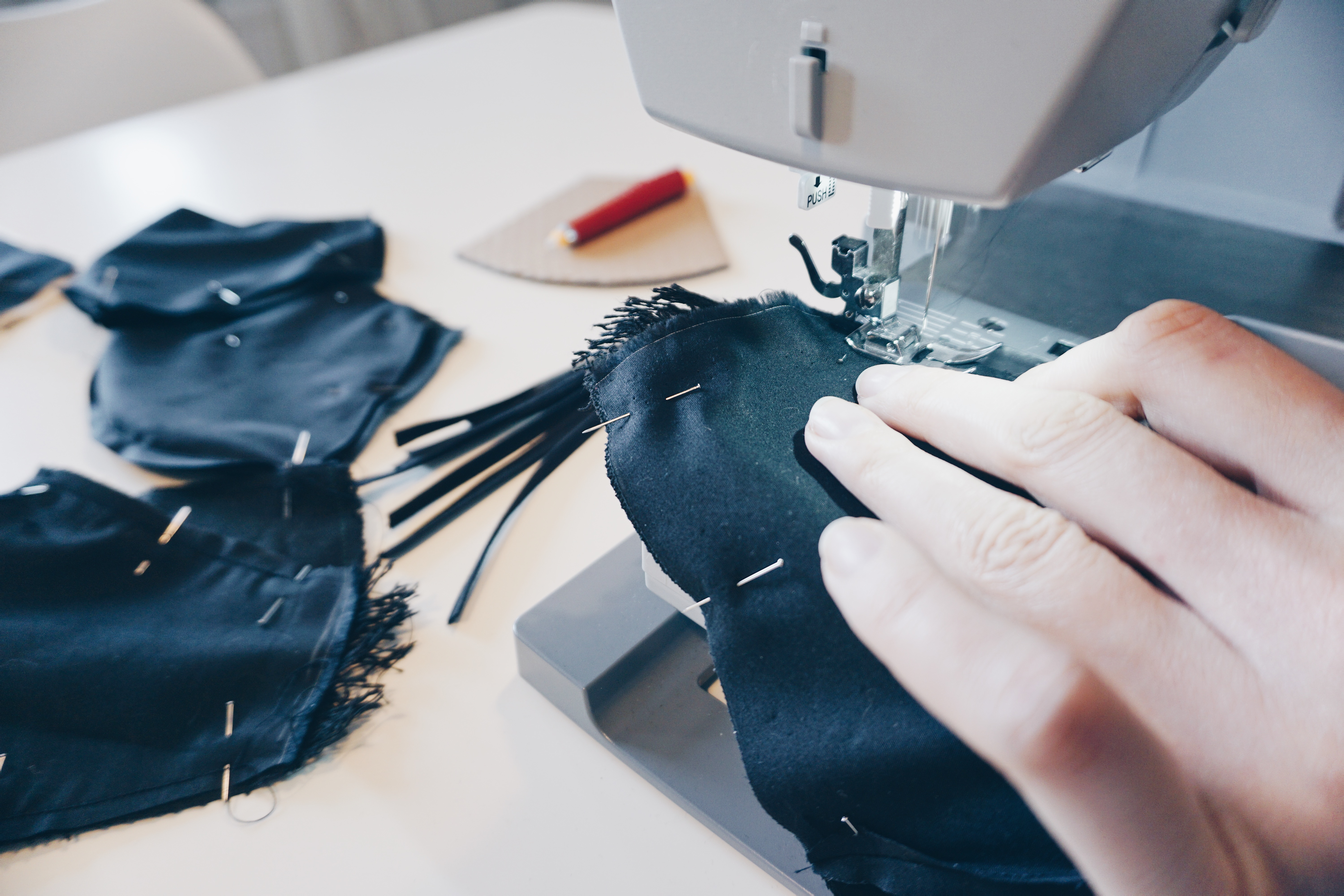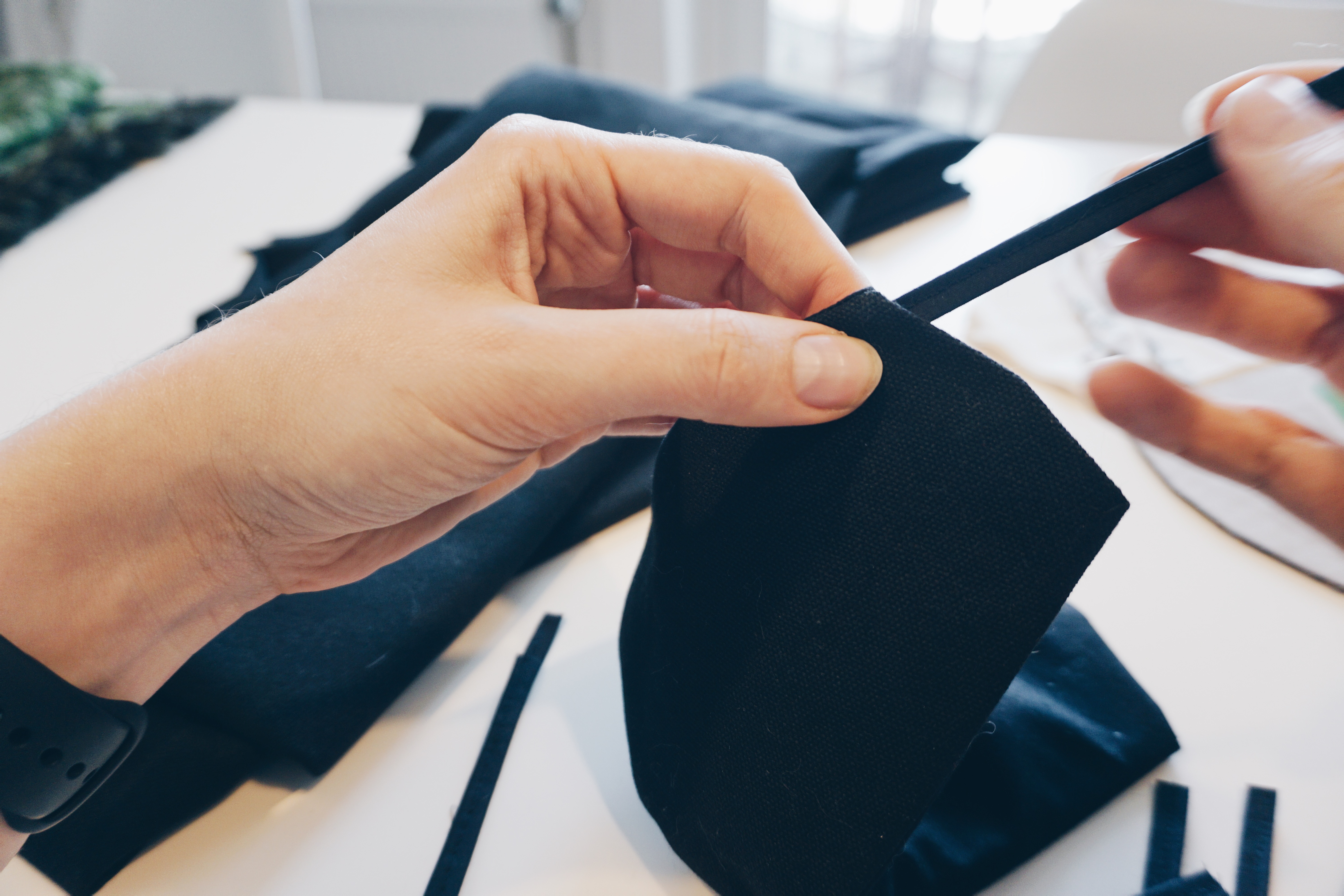 Nun könnt ihr den Verschlussstreifen oder den Draht innerhalb der Maske an der kürzeren Seite platzieren und mit der Hand festnähen. Das müsst ihr nicht aber es bietet der Maske mehr Stabilität am Nasenknochen. Nun werden die Schlaufen befestigt die die Maske später hinter den Ohren sichert.