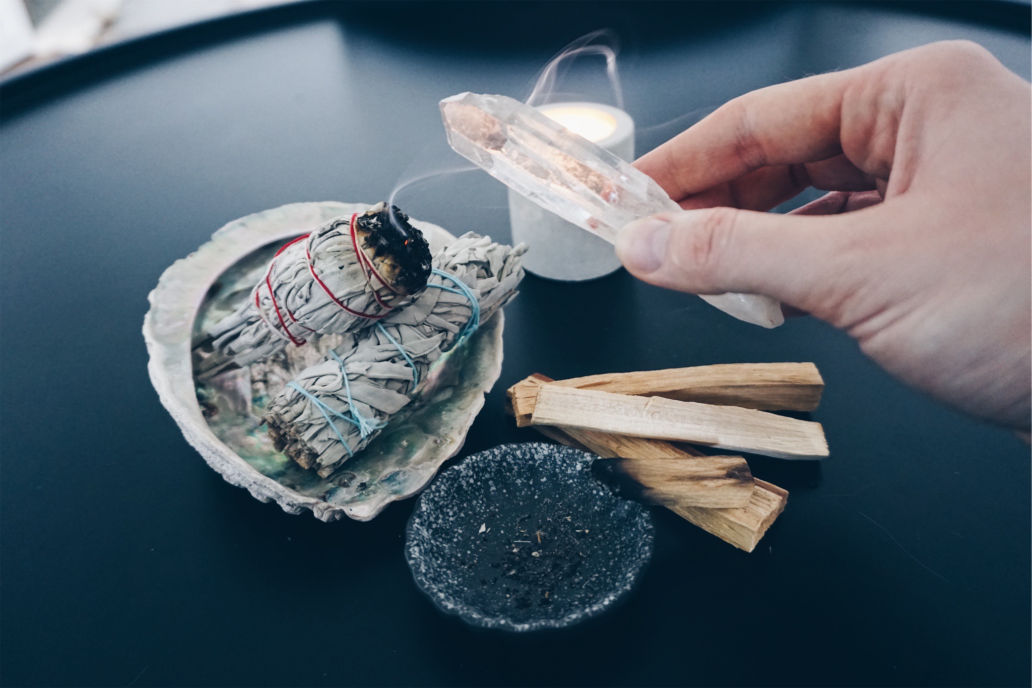 Aber auch wenn Räucherstäbchen für einige schon zu tief im Esoteriksumpf stecken ist das nicht das Endlevel des räucherns. Zu meinem Geburtstag schenkte mir eine Freundin dann eine wunderschöne Muschel als Räucherschale und Palo Santo Holz sowie ein Salbeibündel zum räuchern. Ich entdeckte das alles von einer anderen und noch traditionelleren Seite. Es gibt nämlich viele Möglichkeiten zu Räuchern, wie Harze, Kegel oder Spänen. Das fühlt sich dann noch mystischer an als Räucherstäbchen. Smudging habe ich mir daher für die Momente reserviert in denen ich Karten oder Runen lege, meditiere oder tiefe Unruhe ausgleichen will, weil ich dann noch bewusster räuchere als sonst und ritualisiert symbolisch meine Umgebung und mich reinige.