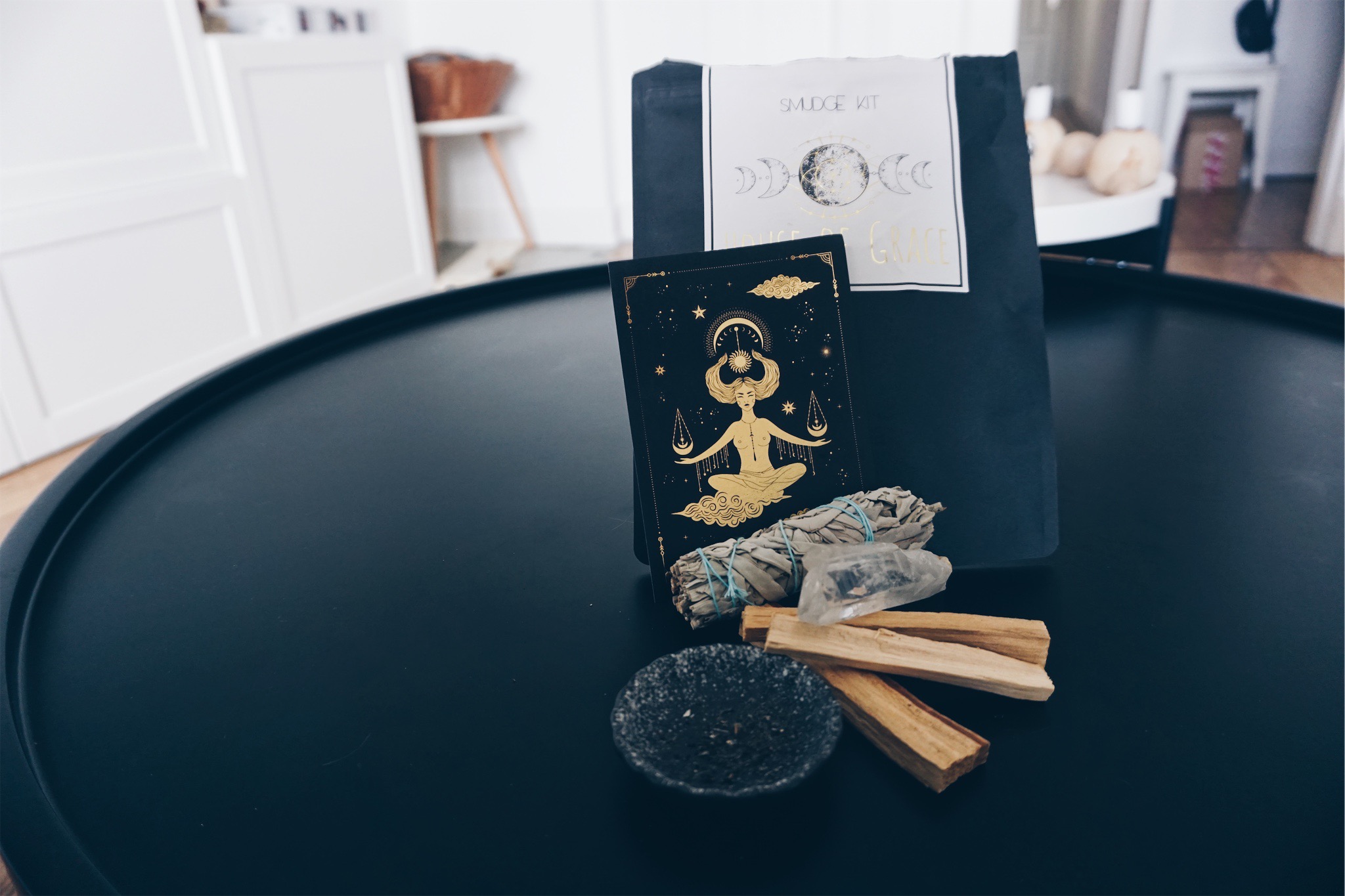Das hier fotografierte, sehr liebevoll gepackte und unfassbar gut riechende Smudge Kit ist von meiner wundervollen Freundin Anna Frost und für euch in ihrem Shop erhältlich. Es besteht aus einem Salbei Smudgestick, einem Bergkristall, Palo Santo Holz, einer kurzen Anleitung sowie einem Schälchen zum fangen der Asche. Perfekt um für sich selbst ein Ritual zu entdecken. Ein Ritual das beruhigt, reinigt und erdet.
